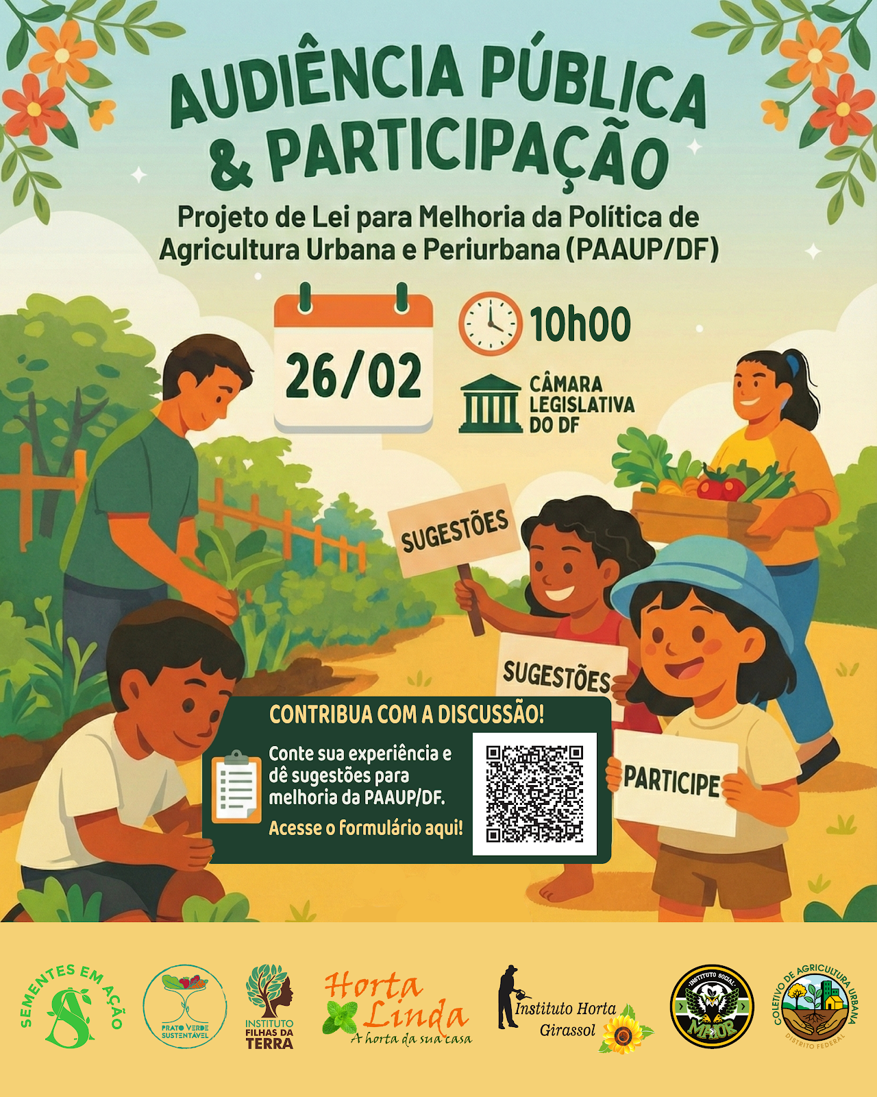 Convidamos toda a comunidade, agricultores urbanos, ativistas e gestores públicos, estudantes, pesquisadores e universidades para a apresentação da proposta de Indicação de Projeto de Lei para o aprimoramento da Política de Agricultura Urbana e Periurbana do Distrito Federal (PAAUP-DF). Este documento é fruto de uma construção coletiva entre o Instituto Social Maior e o Coletivo de Agricultura Urbana do Distrito Federal, baseada em evidências científicas e na vivência real das hortas comunitárias em nossos territórios. O que precisamos melhorar? Embora a legislação vigente reconheça a importância das hortas, ela ainda apresenta lacunas que dificultam a permanência e o crescimento dessas iniciativas. Nossa proposta foca em cinco pilares fundamentais: • Acesso à Água: Instituição de subsídios, programas de instalação de cisternas e mecanismos de reuso de águas cinzas acompanhados pela CAESB. • Regularização e Desburocratização: Criação de protocolos interinstitucionais claros entre SEAGRI, SEDUH, IBRAM e Administrações Regionais para acabar com as barreiras burocráticas que hoje paralisam novas iniciativas. • Infraestrutura para Permanência: Padronização de materiais para cercamento seguro e autorização para construção de abrigos funcionais, como banheiros ecológicos e áreas de armazenamento. • Apoio Técnico Estruturado: Garantia de que os órgãos competentes da administração pública voltados à agricultura e extensão rural ofereçam assessoria técnica contínua, cronogramas de visitas regulares e capacitação em práticas agroecológicas sustentáveis. • Governança Participativa: Efetivação dos Grupos Executivos com ampla participação social e chamamento público. A importância das Hortas Urbanas As hortas urbanas são estratégicas para a segurança alimentar, a sustentabilidade ambiental (preservando nossas águas e reduzindo ilhas de calor) e a inclusão social, especialmente em territórios de vulnerabilidade. Sua participação é fundamental para transformarmos o DF em um modelo de soberania alimentar e ocupação cidadã do espaço público.